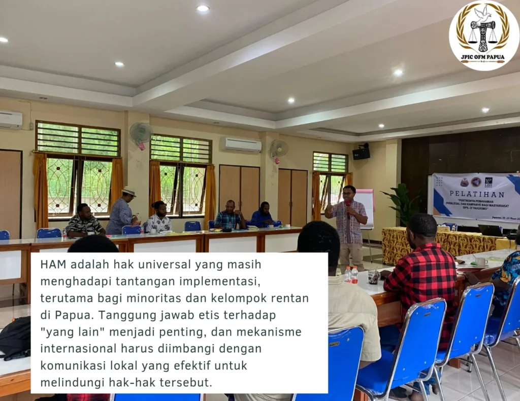 Pelatihan ini berlangsung selama lima hari dengan rangkaian materi hukum, advokasi, komunikasi, dokumentasi, hingga kampanye publik. Kehadiran JPIC OFM Papua dalam dua sesi utama mempertegas komitmen pastoral dan advokasi mereka untuk mendampingi masyarakat adat dan kelompok rentan. Dengan bekal pengetahuan paralegal, peserta diharapkan mampu menjalankan fungsi mediasi, advokasi, investigasi, dan kampanye secara independen, etis, dan berjejaring, sehingga menjadi pembela HAM di akar rumput yang menjaga tanah, hutan, dan kehidupan komunitas mereka.